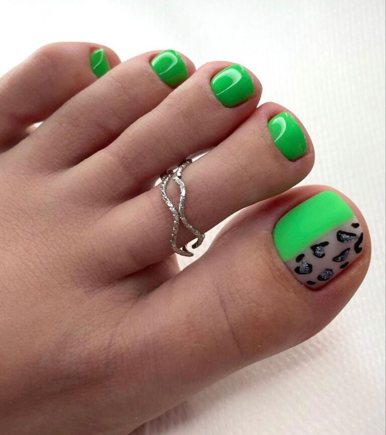 Empezamos esta lista de pedicuras verdes, con un diseño que consiste en pintar todas las uñas en una base esmalte verde, pero con una tonalidad fluorescente, que puede irradiar de gran manera, dándole dinamismo a la propuesta.