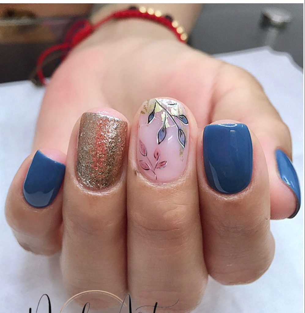 La primera idea que te dejamos una combinación de dos azules que formarán las hojas de las plantas en las uñas de los dedos corazón y anular, éstas se destacan al estar sobre un color base blanco. Mientras que en el resto de las uñas, el color base es azul marino o azul rey.