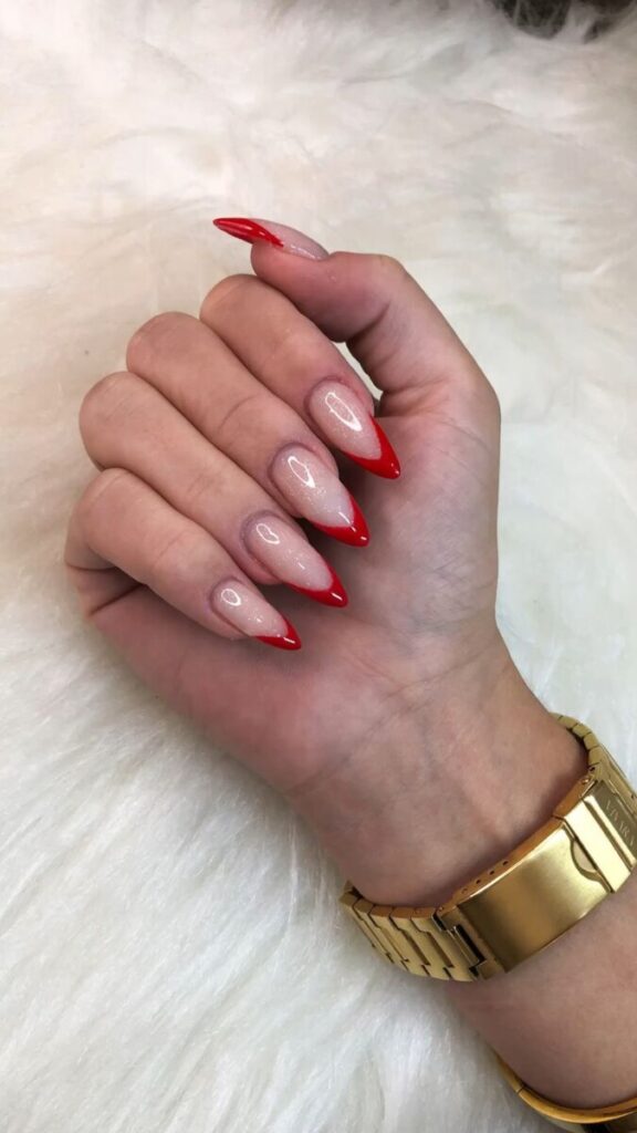 También hemos hablado del rojo, así que ahora le damos la bienvenida al blanco, que transmite paz y pureza. Las uñas de los dedos meñique, índice y pulgar llevan una base de rojo, mientras que en el del corazón y anular se realizan semicírculos ovalados, luego curvas con puntos blancos sobre un fondo rosado claro o color nude.
