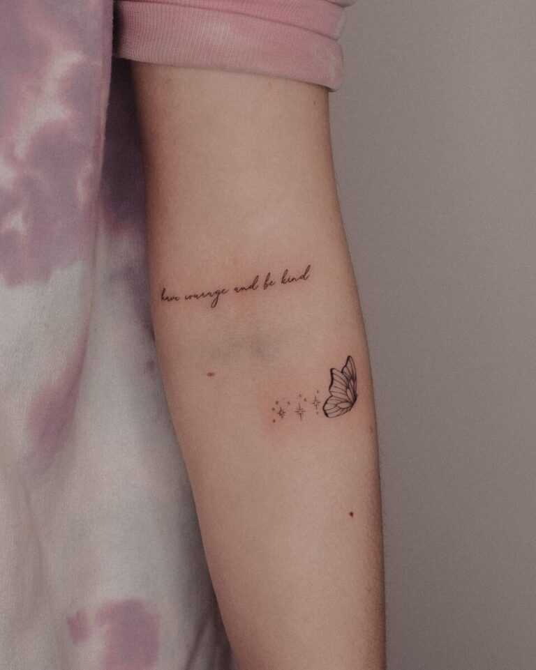 Empezamos con esta lista de frases para tatuarse de mujer, con un diseño que se compone de una frase que dice: “ten coraje y se amable como una pequeña mariposa”. Este es un animal que nos evoca al constante aprendizaje y crecimiento personal. También nos lleva hacia la libertad, y hacia la paz, como también a la evolución y ascensión. Es por ello, que es una frase que nos hace reflexionar un poco sobre nuestra educación y trato con las demás personas. Una pequeña mariposa va tatuada en uno de nuestros antebrazos y más arriba, va la frase en letra cursiva y en inglés.