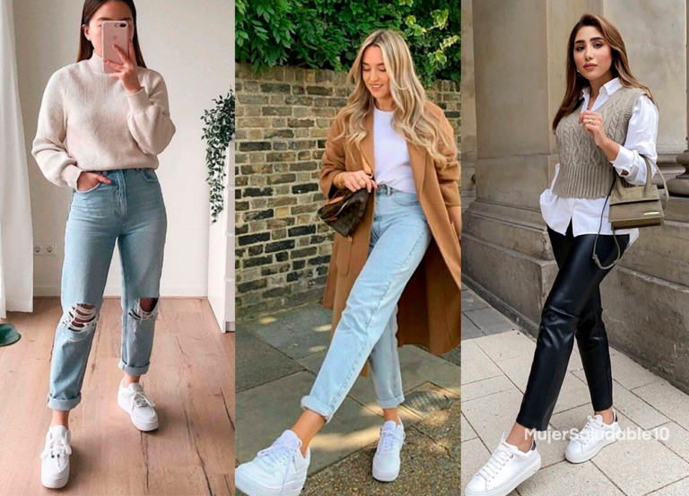 Las converse blancas son una excelente opción si tu trabajo te obliga a estar mucho tiempo sentada porque no te cansarás con ellos. El truco está en combinarlos con una blusa formal; puede ser cuello tortuga o una lisa que combines con un gabán largo. Un jean o un pantalón de un mismo tono completa tu outfit.
