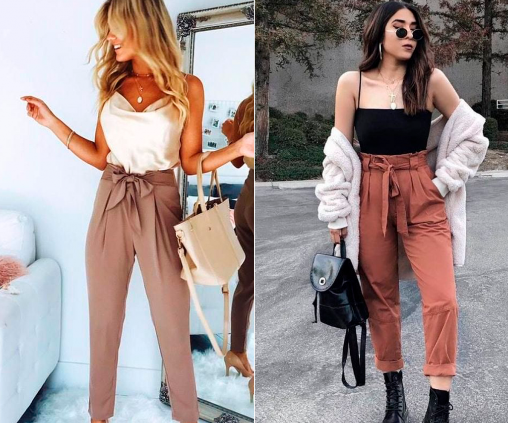 Los pantalones con cintura en forma de bolsa de papel. Se caracterizan por ser muy cómodos; Generalmente su ajustes es ancho, tipo así, suelto, pareciera que solo puede usarse para la casa y no es así. Es una prenda; Que si la sabes combinar y es favorecedora para la forma de tu cuerpo. Puede ser sorprendentemente, sofisticada para tu ajuar; Donde, puedes llevarla para la escuela, la universidad, la oficina, incluso para una salida en la noche.