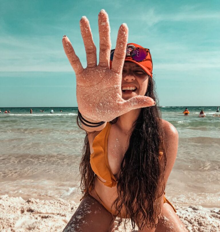 En la playa, podemos aprovechar elementos que usaremos a nuestro favor. Por ejemplo, nos vamos a valer de la arena, para lograr una foto magnífica. Juega con la arena y trata de formar figuras con ella, toma una cantidad y llévala hacia arriba, ubica tu cuerpo en forma de s de manera que reduzca tu figura. Encárgate de tomar de fondo el gran paisaje de la arena, mar y cielo.