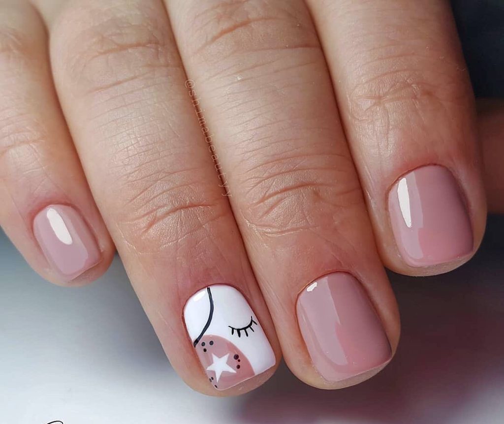 Un diseño muy delicado. Pinta las uñas de color rosa exceptuando el anular. En él aplica el color blanco como base y en una esquina dale un toque de color con el rosa de las bases. Para decorar haremos una estrella blanca sobre la mancha y con un pincel delgado haremos unos puntos alrededor. También diseña un párpado cerrado con unas pestañas simulando un ojo cerrado y tenemos el diseño completo.