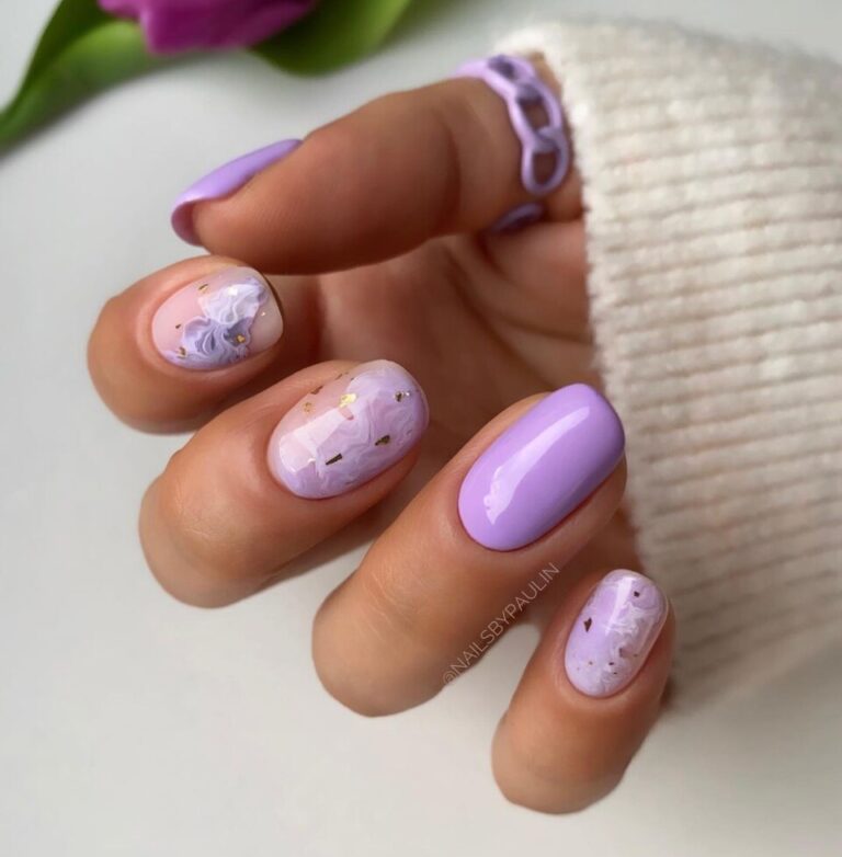El efecto marmolado, es una técnica muy acertada en el nail art y que en esta manicura, se hace presente en color lila y morado, en un perfecto difuminado sobre las uñas índice corazón y meñique, que además, se acompañan de pequeños apliques dorados. Mientras que las uñas pulgar y anular, llevan una base de esmalte sencilla en color lila.