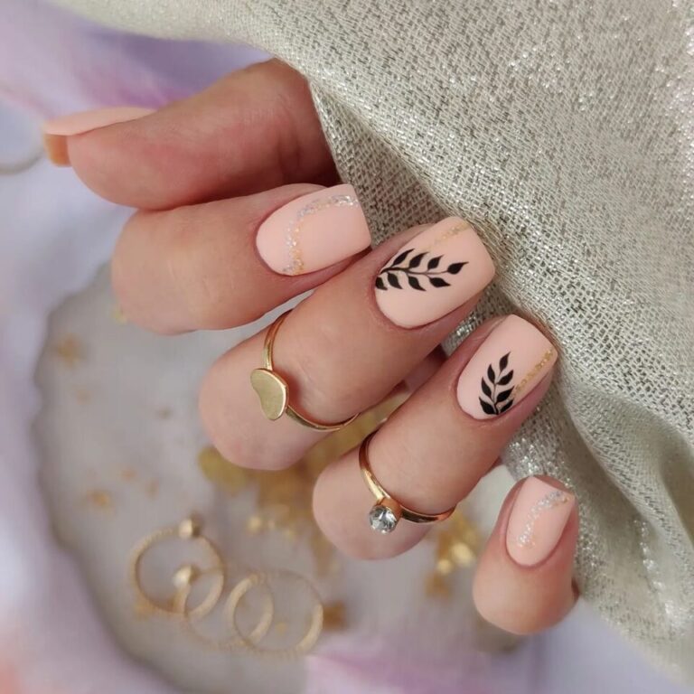 Este es otro diseño súper sencillo, delicado y apropiado, ya sea para tu día a día o un evento importante. Las ramas en color negro le da un hermoso contraste al diseño, así como las líneas en dorado y plateado permite que sea vea diferente. Este tipo de diseños y combinaciones de color le quedarán bien tanto a las uñas cortas como a las largas.