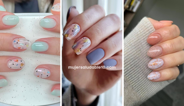 Las flores también tienen un espacio en los diseños para uñas cortas y elegantes. Lo ideal es que se hagan en la versión más sencilla y utilizando colores pastel, esto sobre una base transparente o nude. Sin embargo, para que el diseño de uñas no se vea tan opaco, puedes incluir algunos toques de glitter o papel metalizado (foil) en dorado.