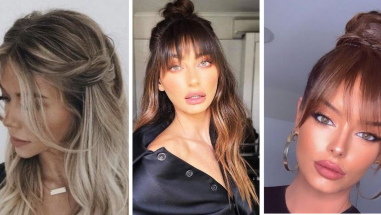 Este peinado con flequillo te va a encantar, consiste en que hagas un semirecogido alto llegando a la coronilla de la cabeza, el resto del cabello va suelto y el flequillo será el protagonista en tu rostro. Haz ondas o rizos en todo el cabello para dar volumen, además en la parte superior haz un estilo de globo simple. Una opción de peinado imperdible.