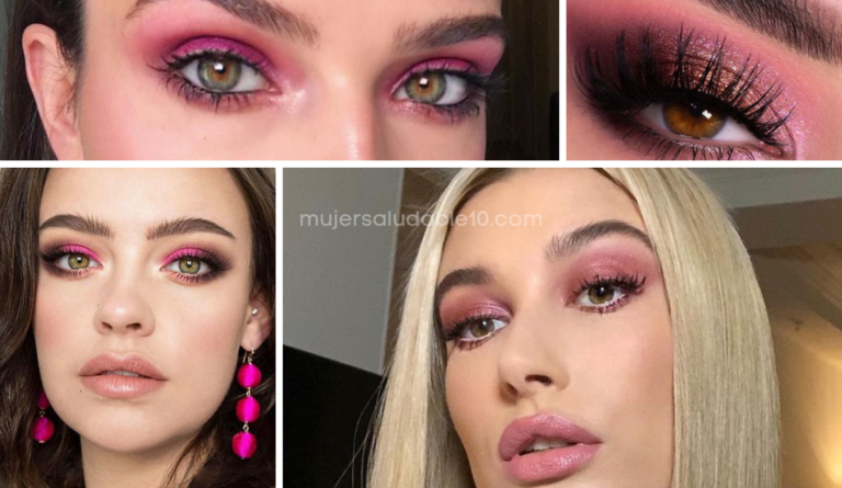 Empezamos con este maquillaje para el otoño, que consiste en que apliques sombra fucsia en los parpados móvil y superiores, para el parpado inferior también pero allí vas a difuminar con sombra negra. Vas a hacer un delineado con sombra rosada en el parpado móvil. Aplica labial café maquilla pestañas y cejas.