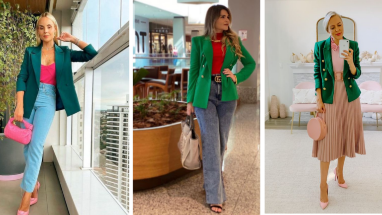 Para este outfit con blazer verde, lo primero que vas a hacer, es usar una falda plisada en color rosado con un cinturón grueso en la cintura, luego opta por una blusa en una tonalidad un poco más clara, pero también en rosado, en un diseño que te pueda favorecer, incrementando elegancia, por ejemplo, una con cuello de bebé. Luego, cierra con tu blazer verde con grandes botones dorados hacia los laterales, tacones rosados puntiagudos y bolso de mano. Quedarás de impacto, donde vayas vas a sobresalir por tu look.