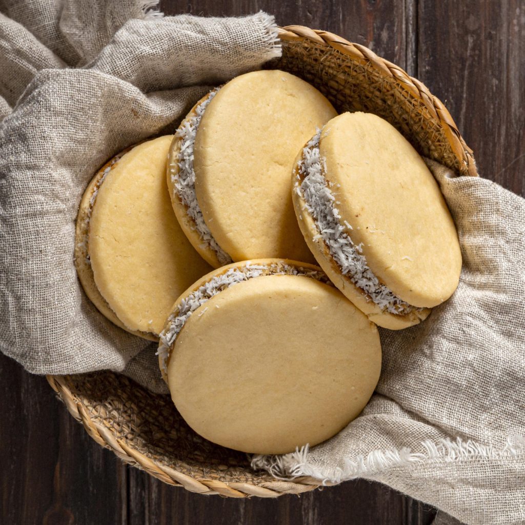 - Por último, rellenamos con dulce de leche o arequipe y colocamos otro alfajor encima. En los laterales rebozamos con coco rallado al gusto (opcional).