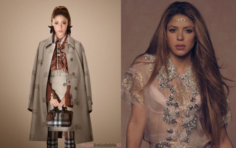 Otro de los emblemáticos outfits de Burberry que Shakira luce con gran estilo, es una falda y una gabardina beige con una camisa, unos leggins tipo botas y un bolso a cuadros que caracteriza tanto a la marca.